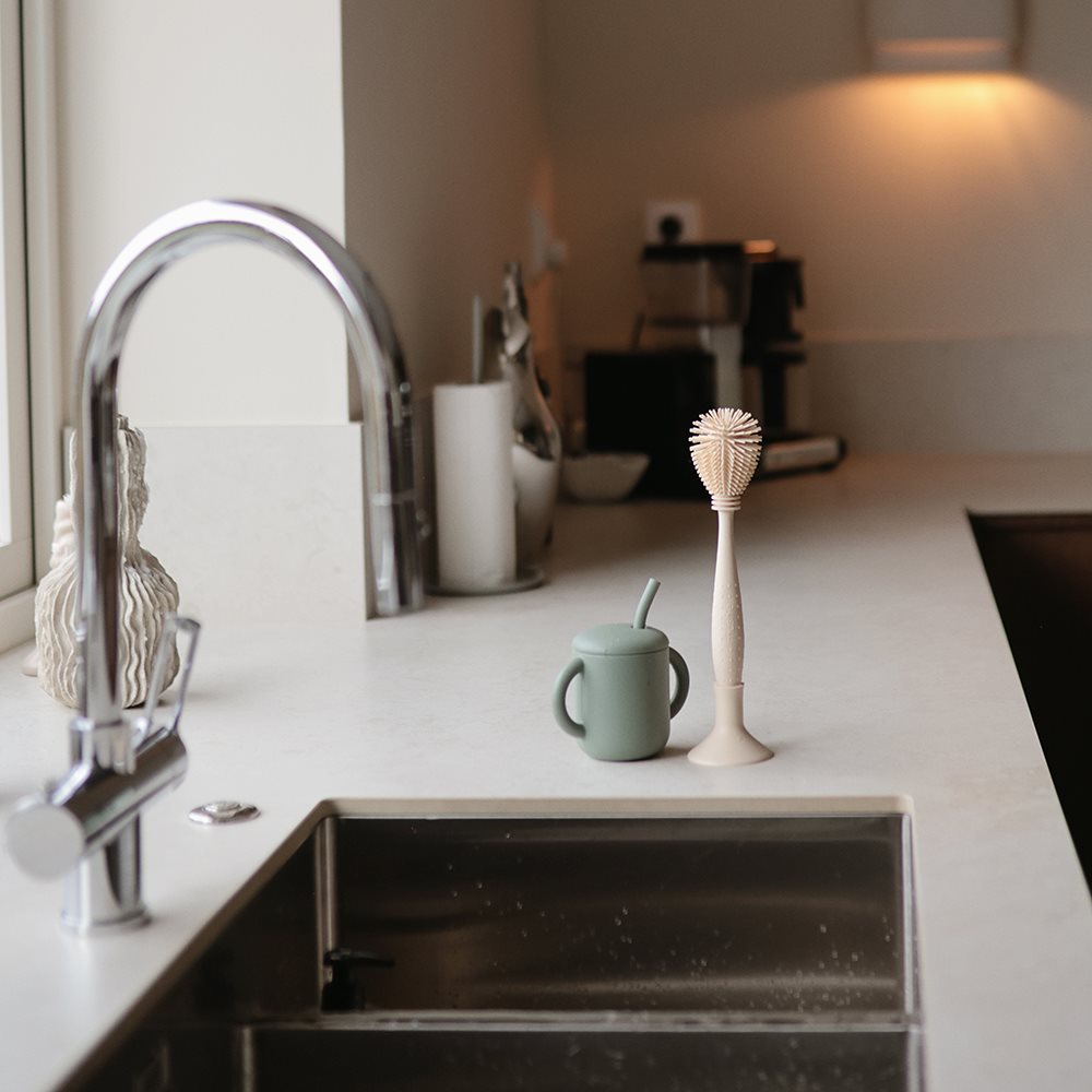 Од другата страна помалата глава на четката е совршена за прецизно чистење на цуцлитеза шишиња но, и за тесни простори. Помалиот крај удобно се складира во основата за вшмукување, минимизирајќи го нередот во кујната и овозможувајќи да е четката лесно достапна. Ергономска текстуирана рачка обезбедува удобно држење, овозможувајќи им на родителите лесно и темелно чистење.